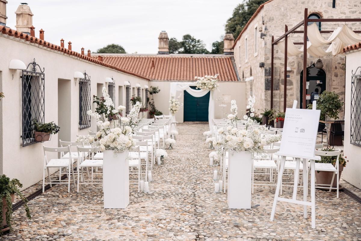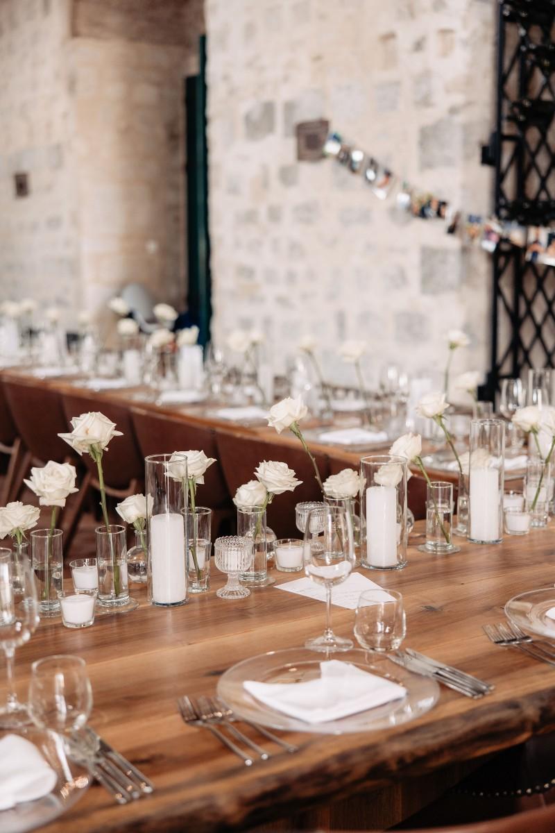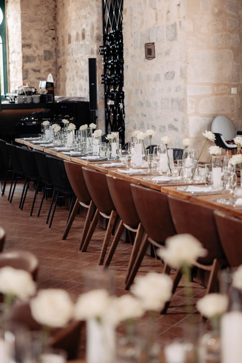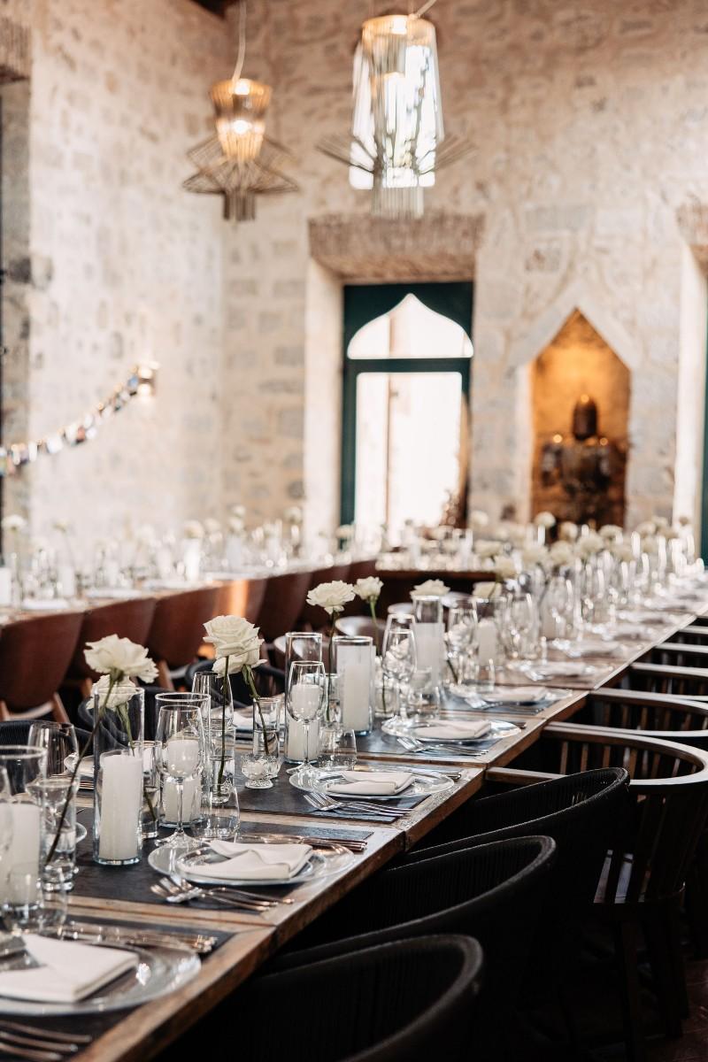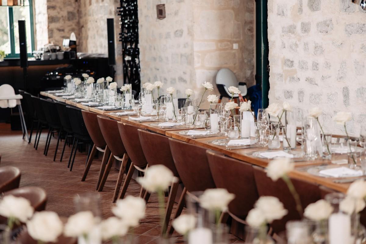Maškovića Han provided a striking historical backdrop for this all-white celebration. Maxi and I. embraced a minimalist yet luxurious floral concept, with exclusively white blooms that brought a sense of quiet elegance to every corner of the venue. Set against the unique architecture and timeless stone walls, the floral design enhanced the serene atmosphere, creating a wedding that felt both ethereal and deeply personal.