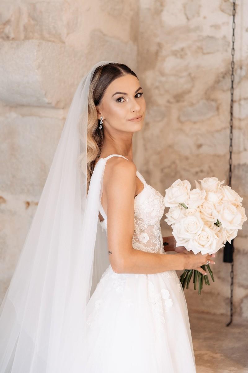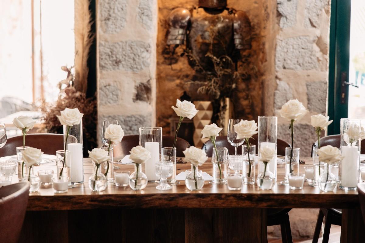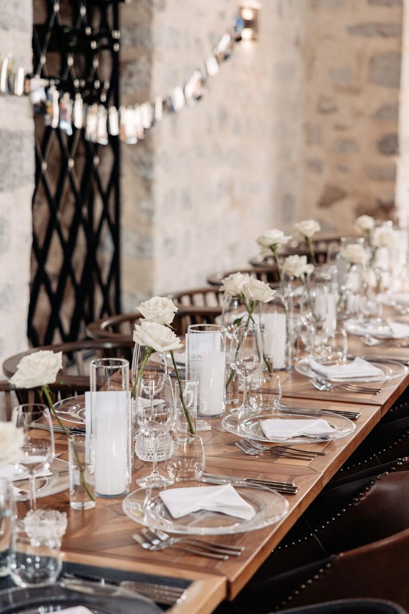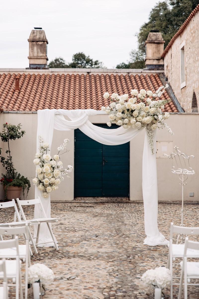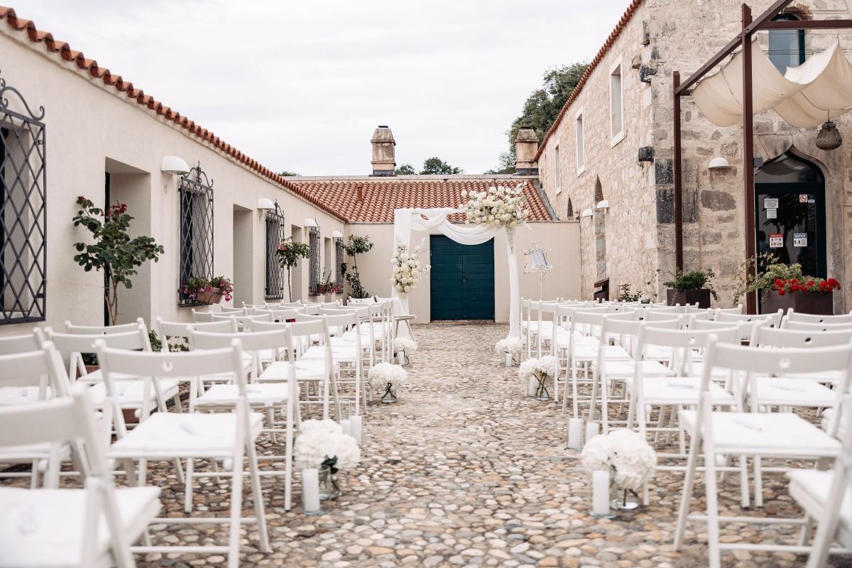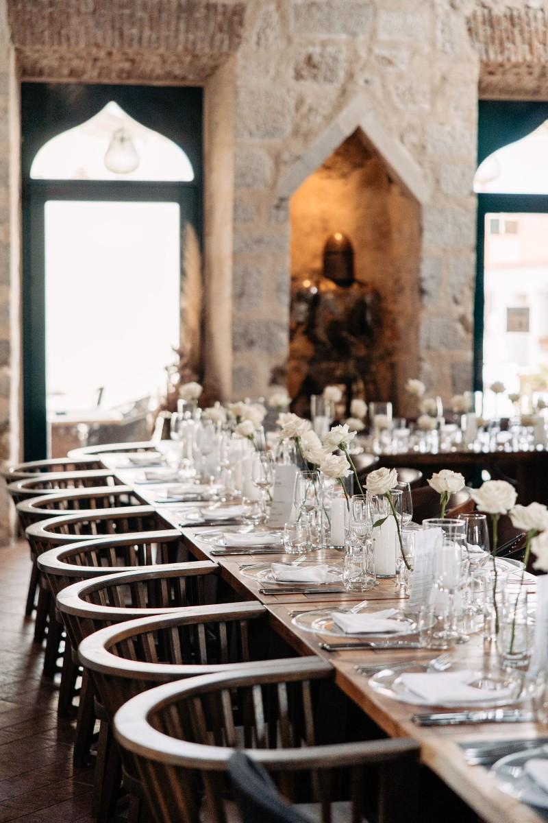 Maškovića Han provided a striking historical backdrop for this all-white celebration. Maxi and I. embraced a minimalist yet luxurious floral concept, with exclusively white blooms that brought a sense of quiet elegance to every corner of the venue. Set against the unique architecture and timeless stone walls, the floral design enhanced the serene atmosphere, creating a wedding that felt both ethereal and deeply personal.