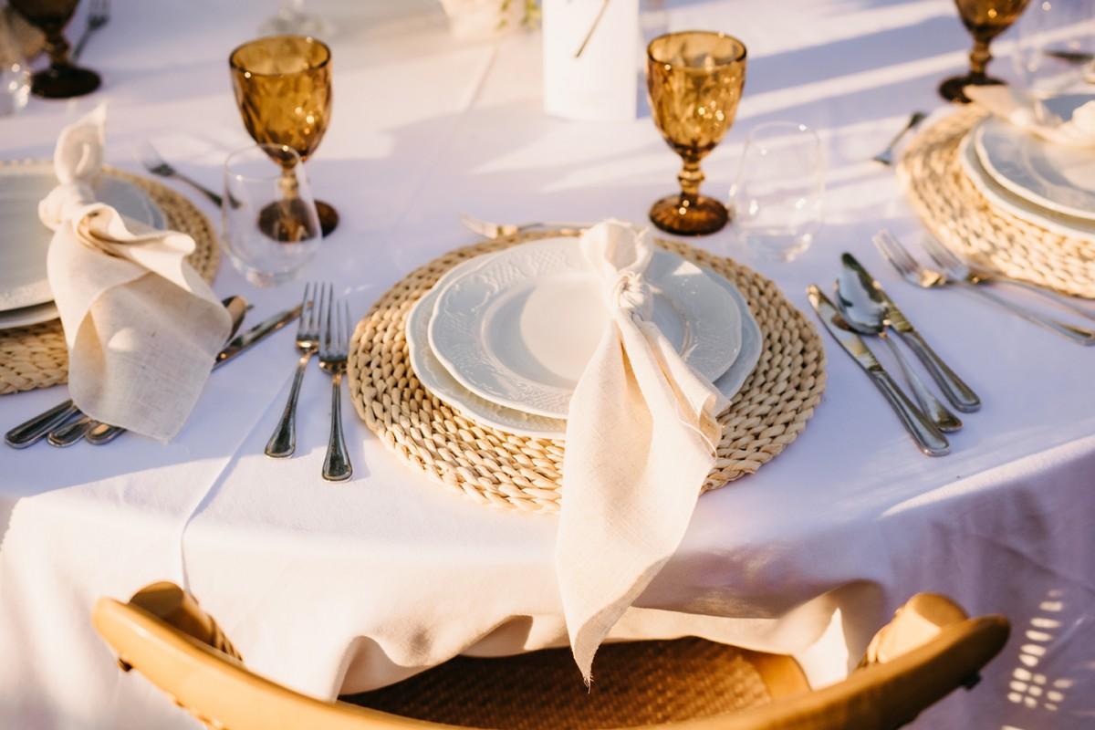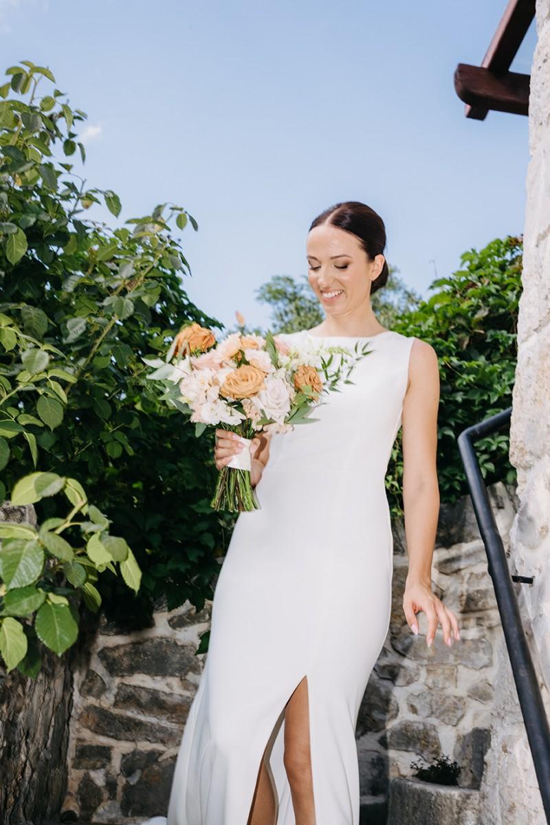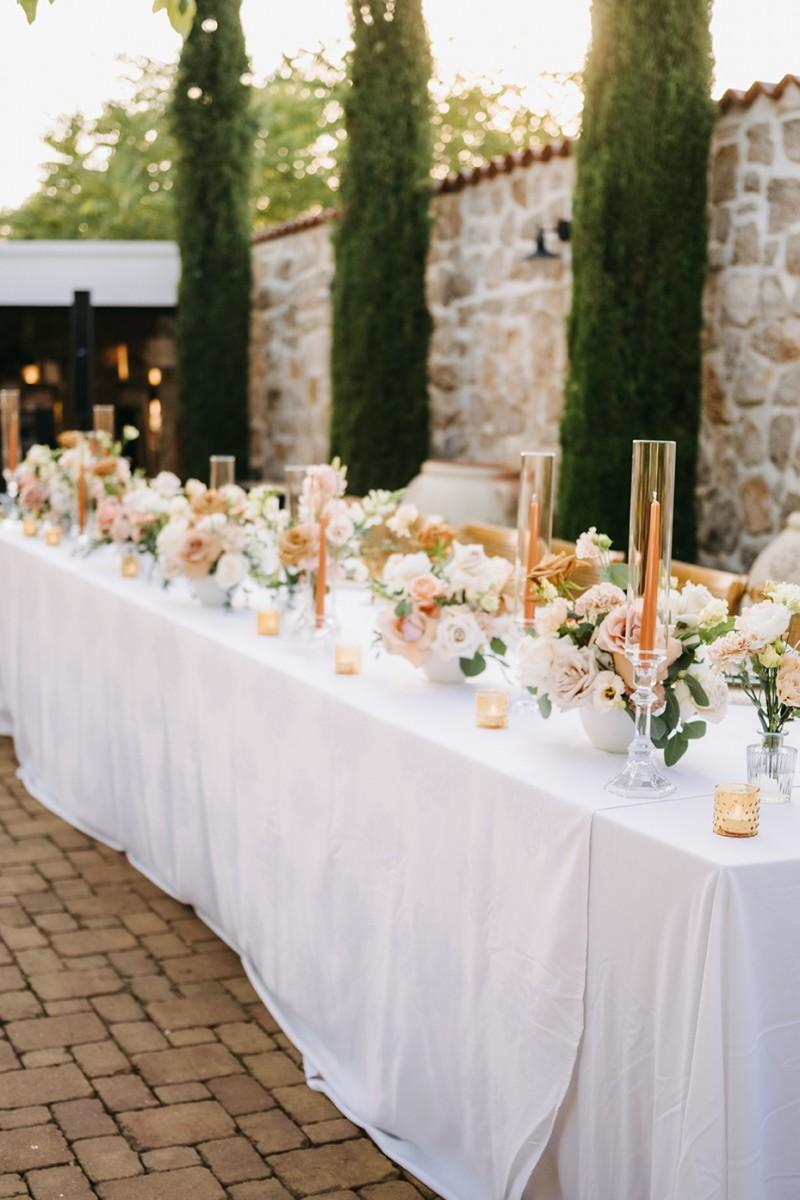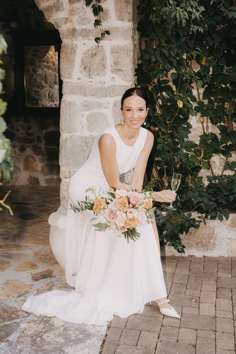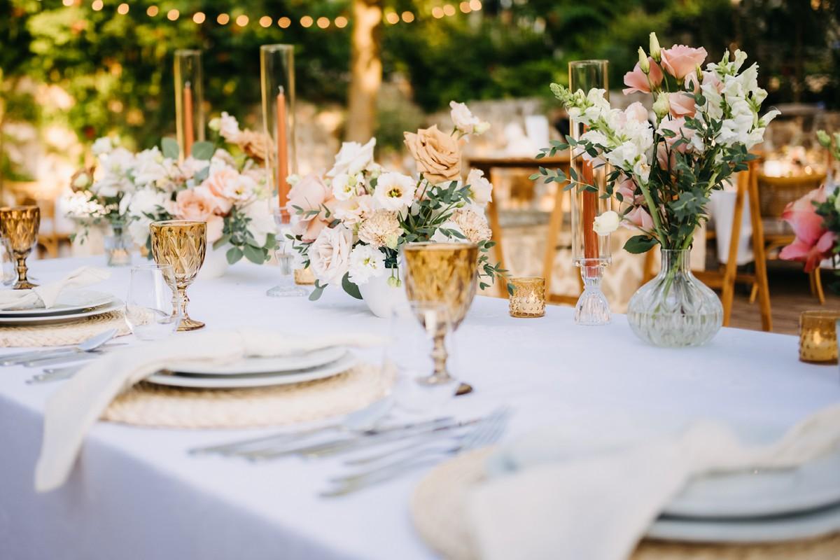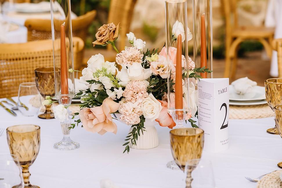 Tables were adorned with elegant floral arrangements in warm peach and soft cream tones, paired with amber glassware and woven placemats that highlighted the venue's earthy, rural charm. Tall candleholders with burnt orange candles added a soft, inviting glow, creating an intimate atmosphere as the evening set in. Every detail enhanced the enchanting setting, making Iva and Sascha’s celebration a memorable and authentic Dalmatian experience.
