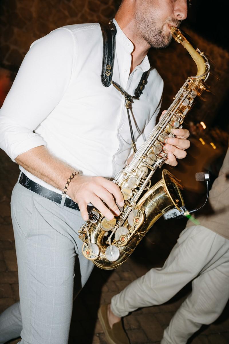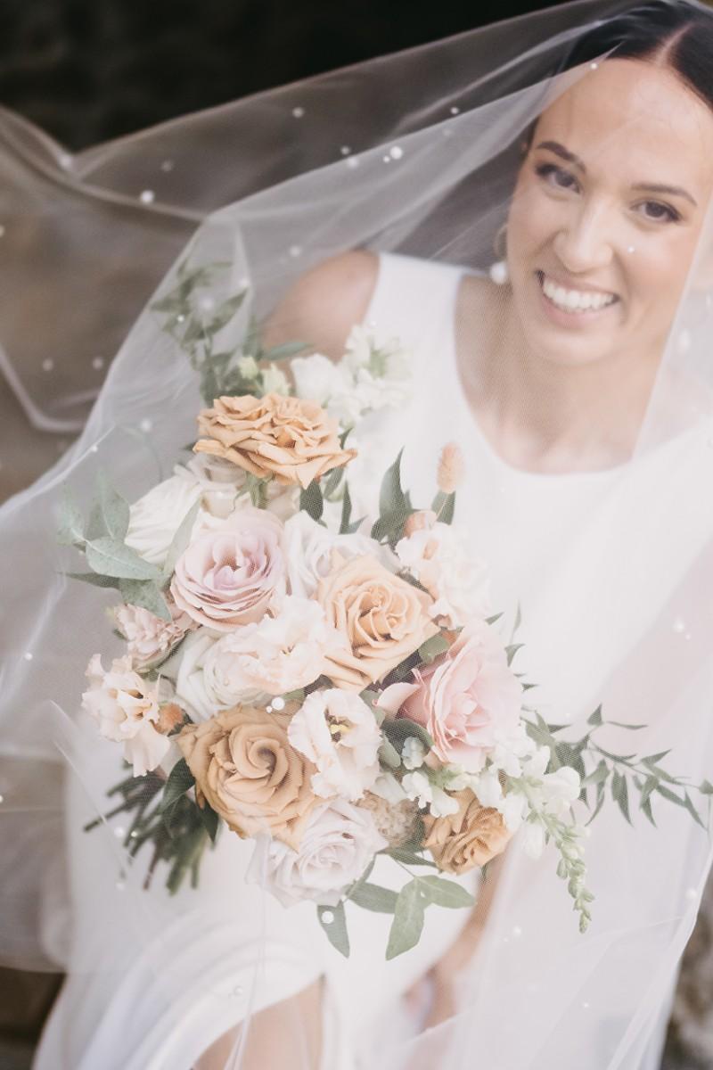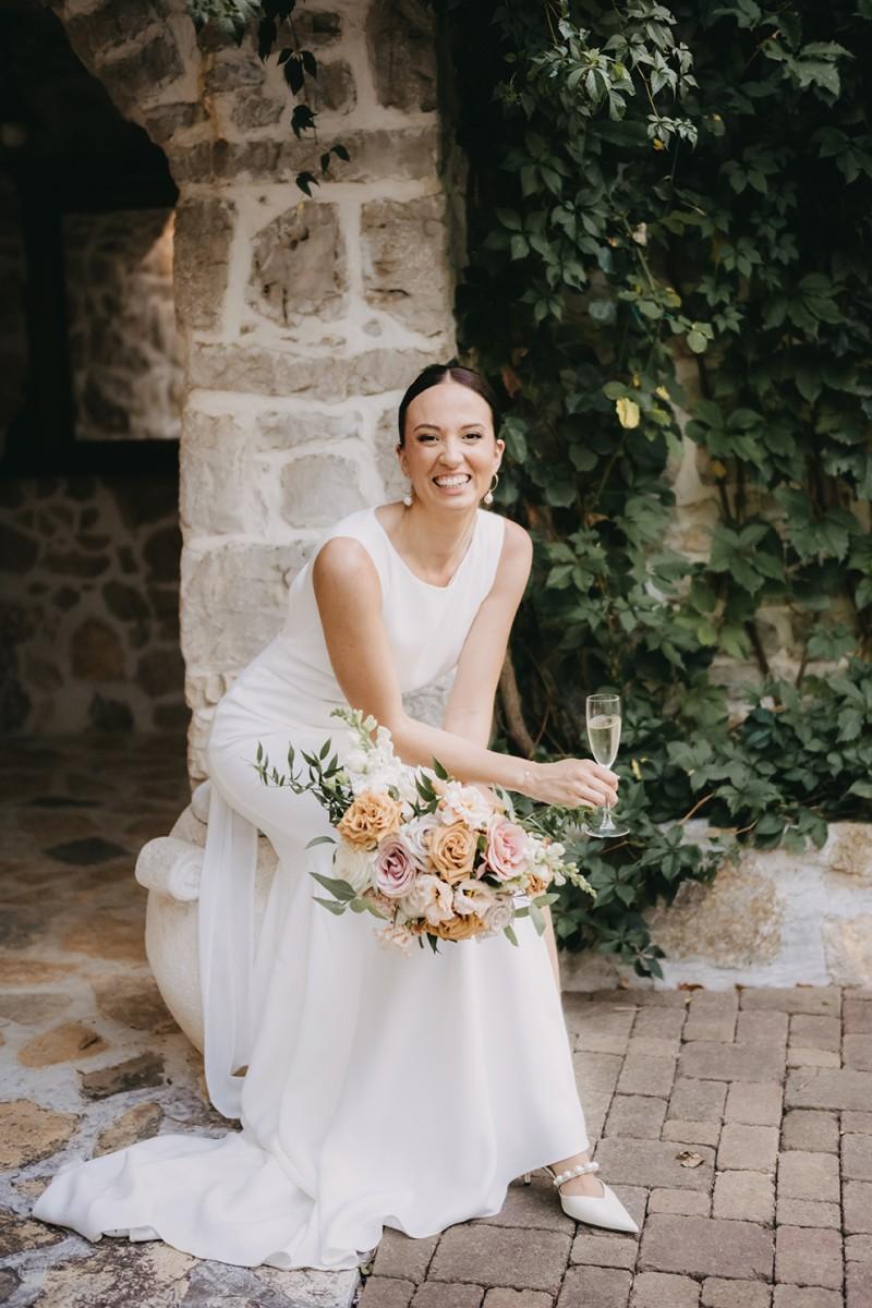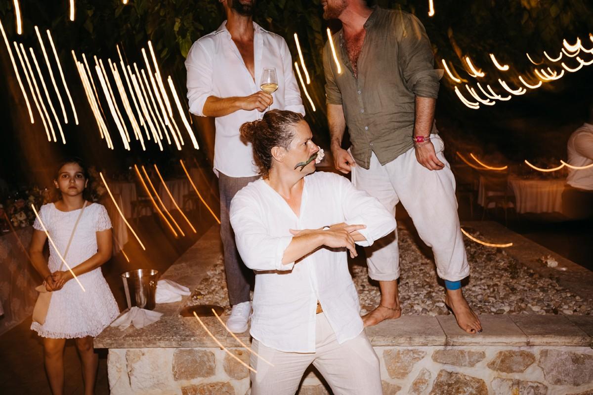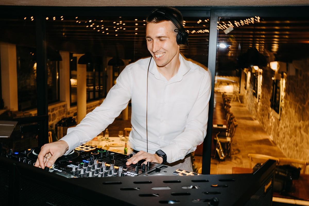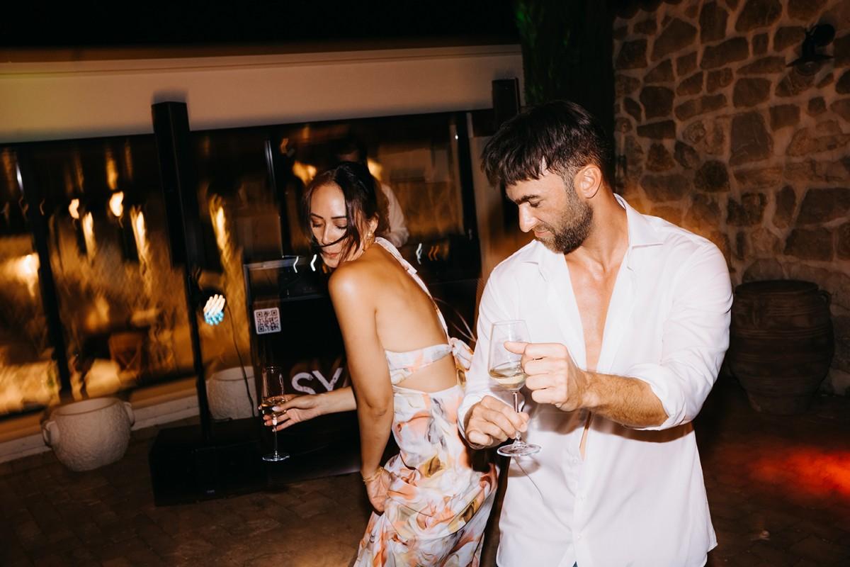 Tables were adorned with elegant floral arrangements in warm peach and soft cream tones, paired with amber glassware and woven placemats that highlighted the venue's earthy, rural charm. Tall candleholders with burnt orange candles added a soft, inviting glow, creating an intimate atmosphere as the evening set in. Every detail enhanced the enchanting setting, making Iva and Sascha’s celebration a memorable and authentic Dalmatian experience.
