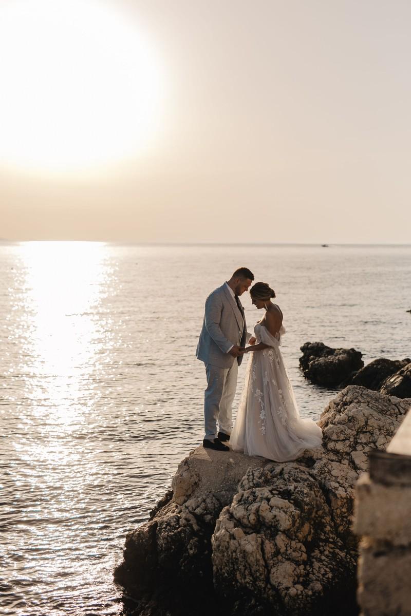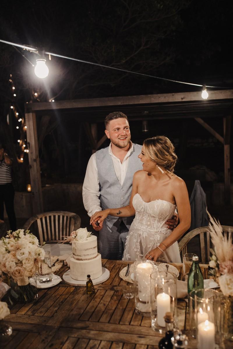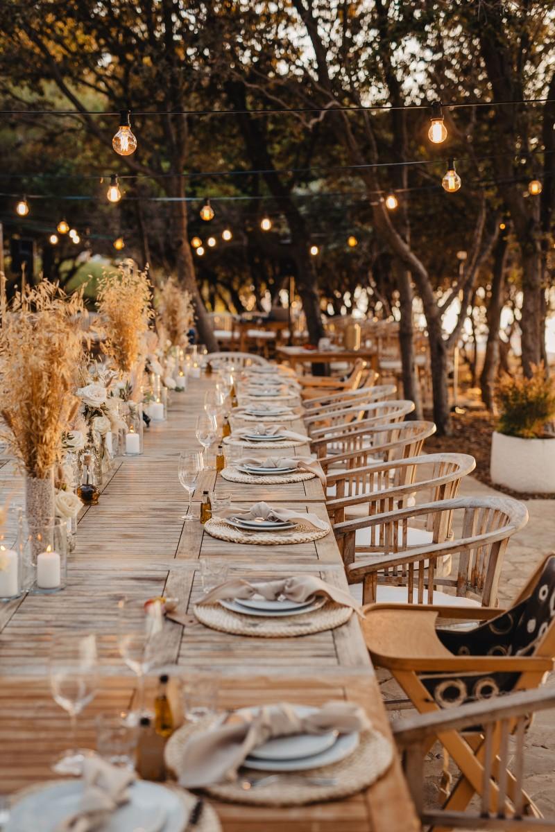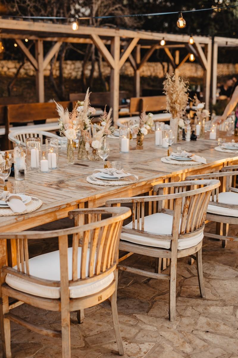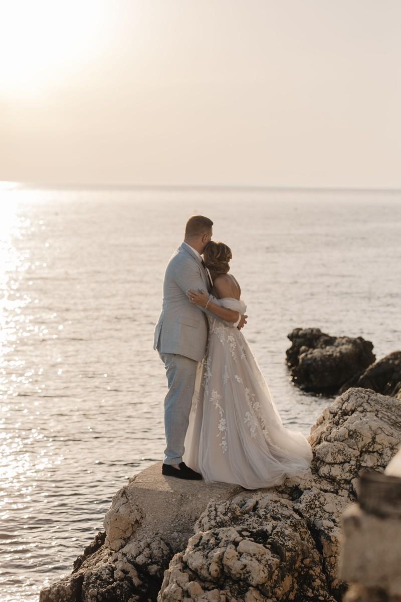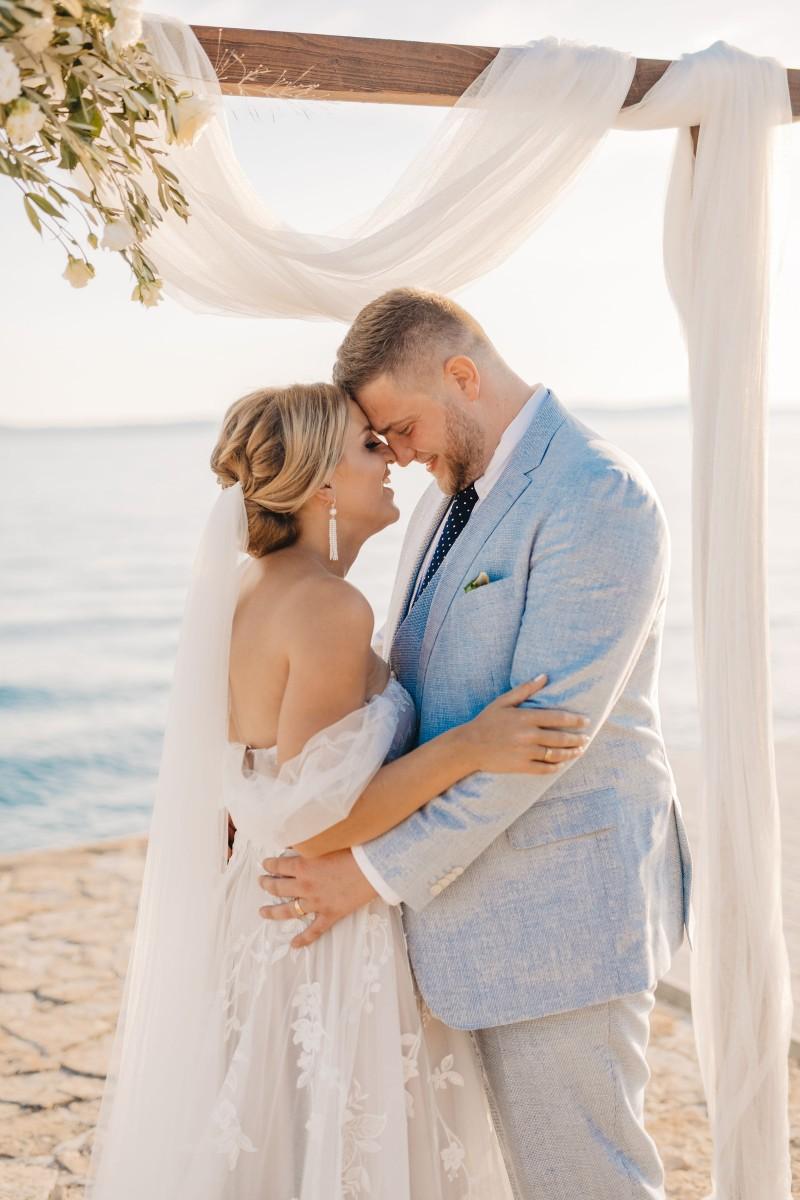 Jessica and Davor exchanged vows by the sea in an intimate ceremony surrounded by white boho-style decor. The setting blended coastal serenity with romantic textures and details, creating a soft and soulful ambiance. As the sun began to set, the evening came alive with the sounds of live saxophone and violin — a beautiful backdrop for their first moments as newlyweds.
