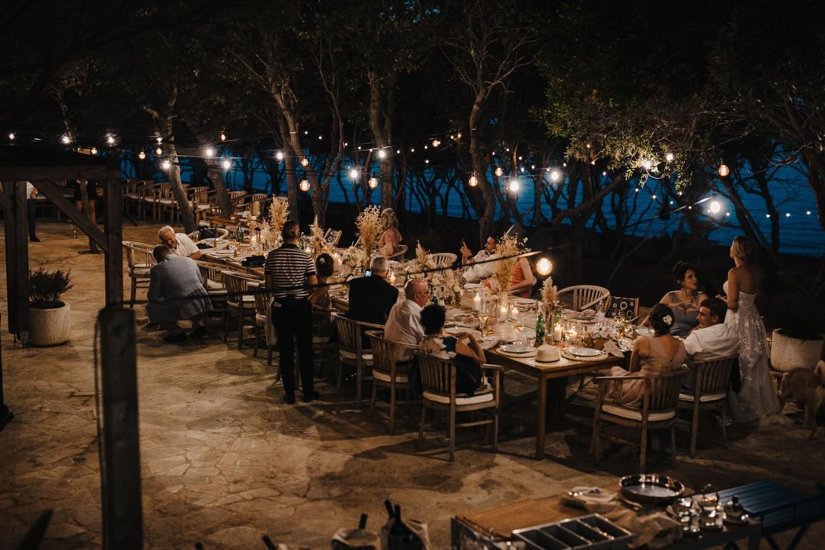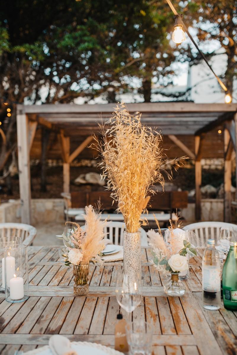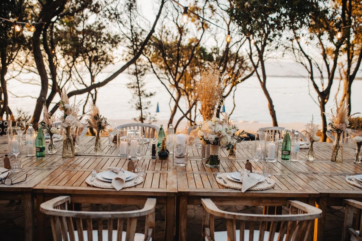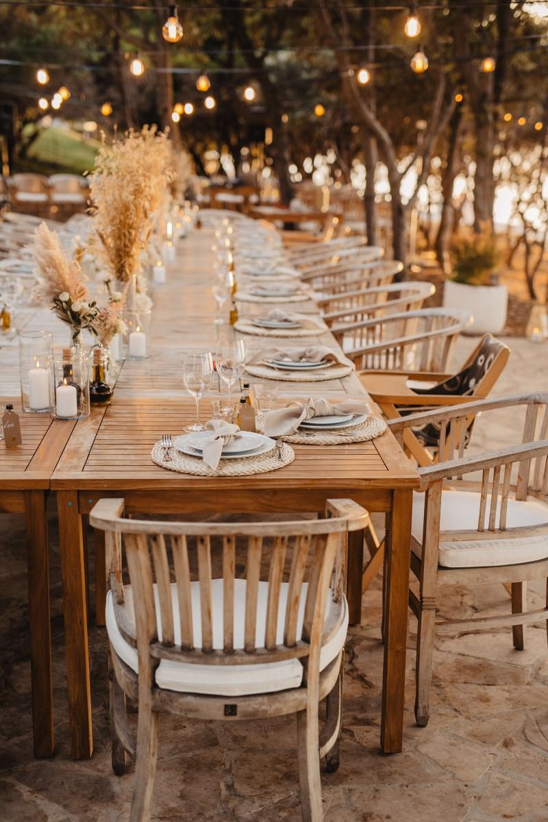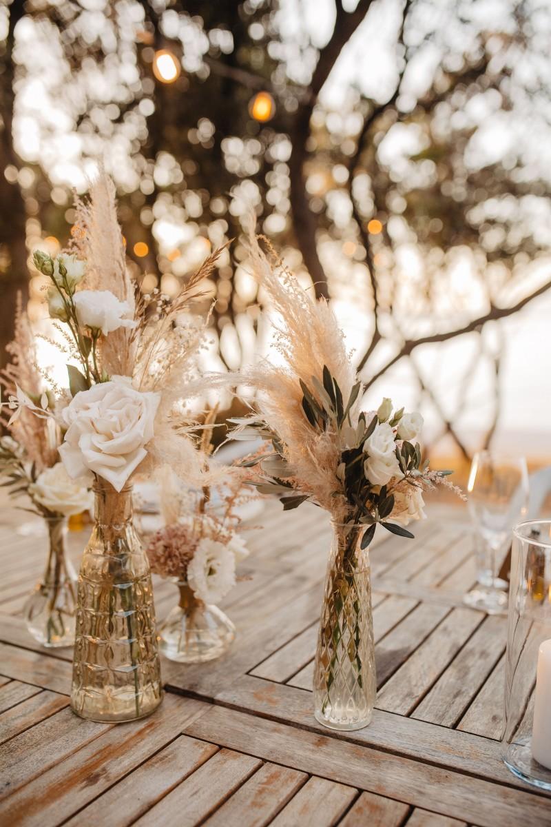 Jessica and Davor exchanged vows by the sea in an intimate ceremony surrounded by white boho-style decor. The setting blended coastal serenity with romantic textures and details, creating a soft and soulful ambiance. As the sun began to set, the evening came alive with the sounds of live saxophone and violin — a beautiful backdrop for their first moments as newlyweds.