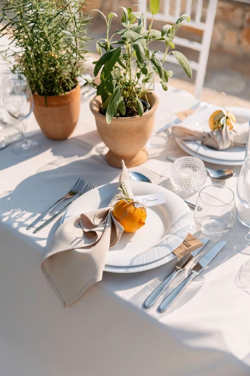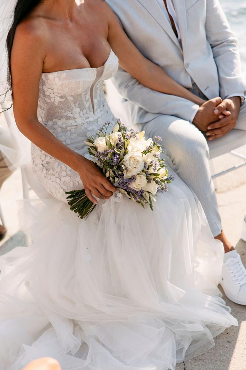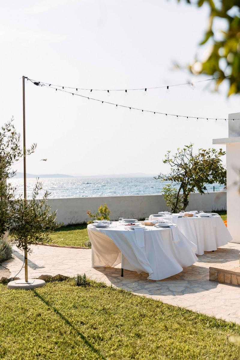 Set on the sunlit terrace of Villa Lanterna in Puntamika, near Zadar, Bettina and Clemens exchanged vows surrounded by the scents and colors of the Mediterranean. Instead of traditional flowers, the decor featured aromatic herbs like lavender, rosemary, and sage — a beautiful, earthy alternative that reflected the relaxed and natural spirit of the day. Intimate, fresh, and full of local charm.