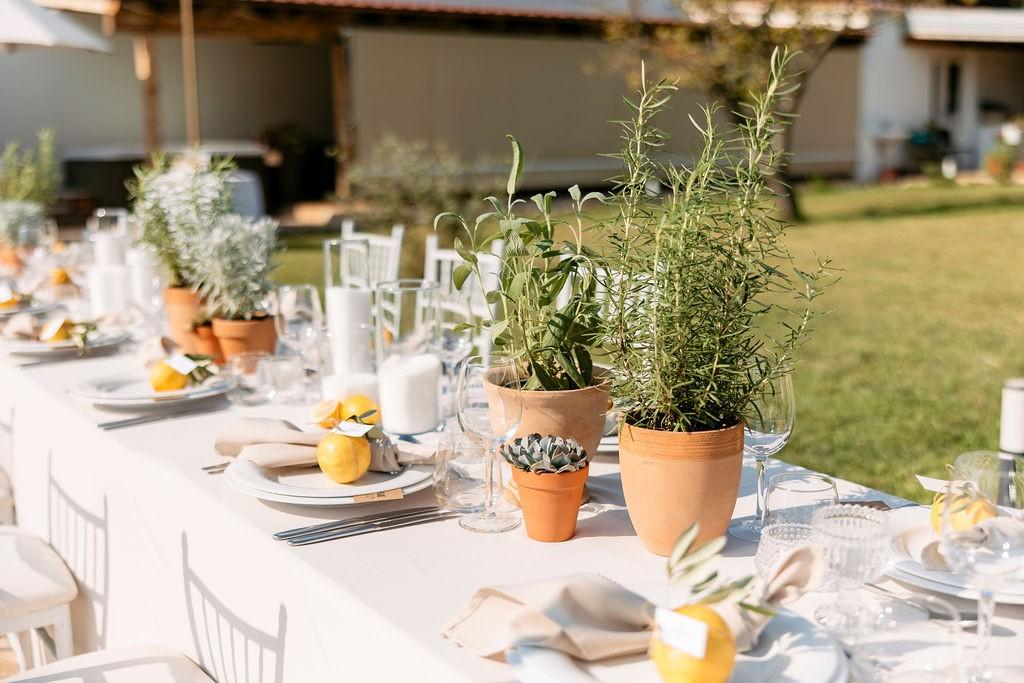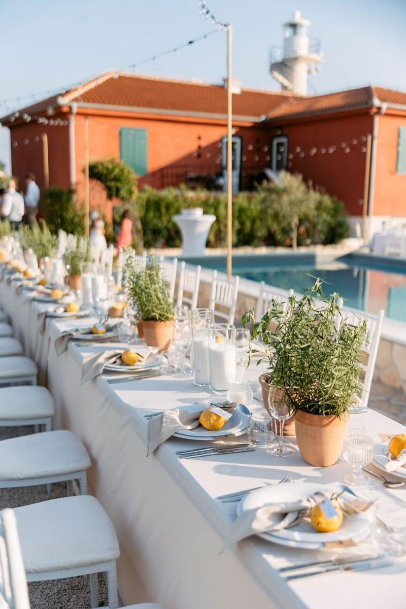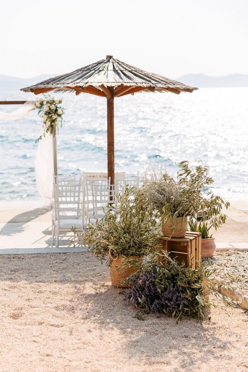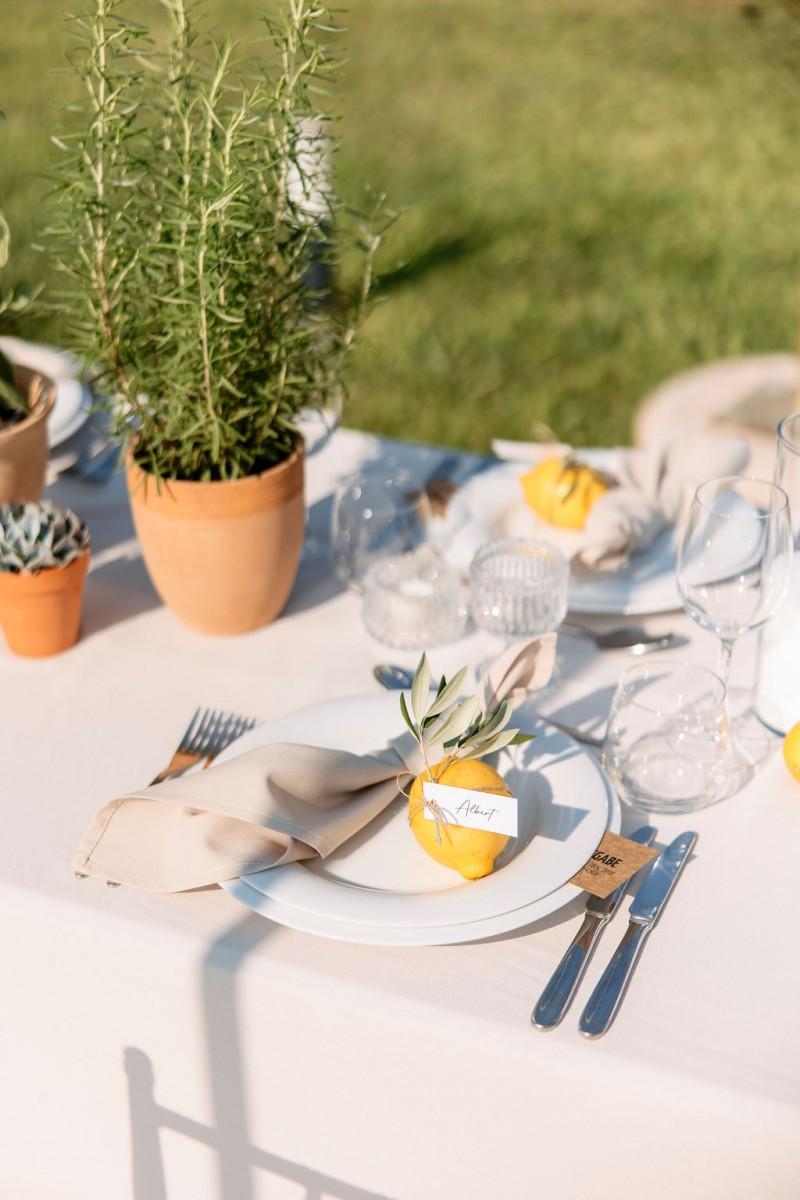Set on the sunlit terrace of Villa Lanterna in Puntamika, near Zadar, Bettina and Clemens exchanged vows surrounded by the scents and colors of the Mediterranean. Instead of traditional flowers, the decor featured aromatic herbs like lavender, rosemary, and sage — a beautiful, earthy alternative that reflected the relaxed and natural spirit of the day. Intimate, fresh, and full of local charm.