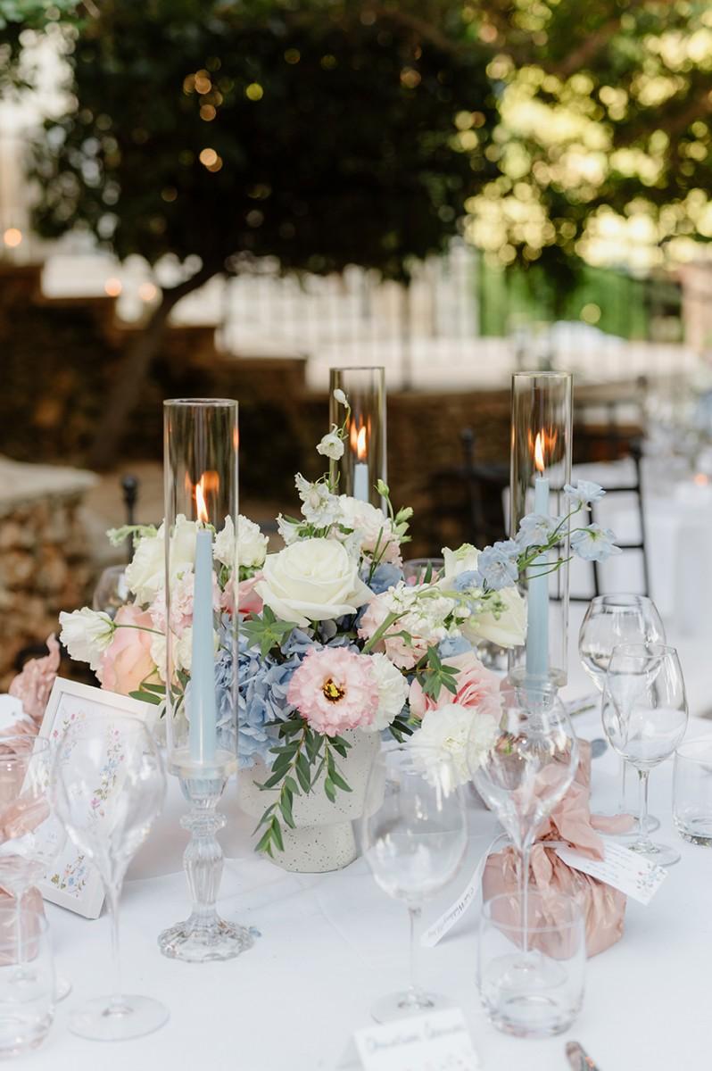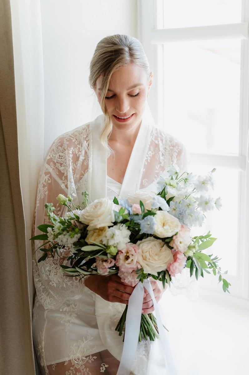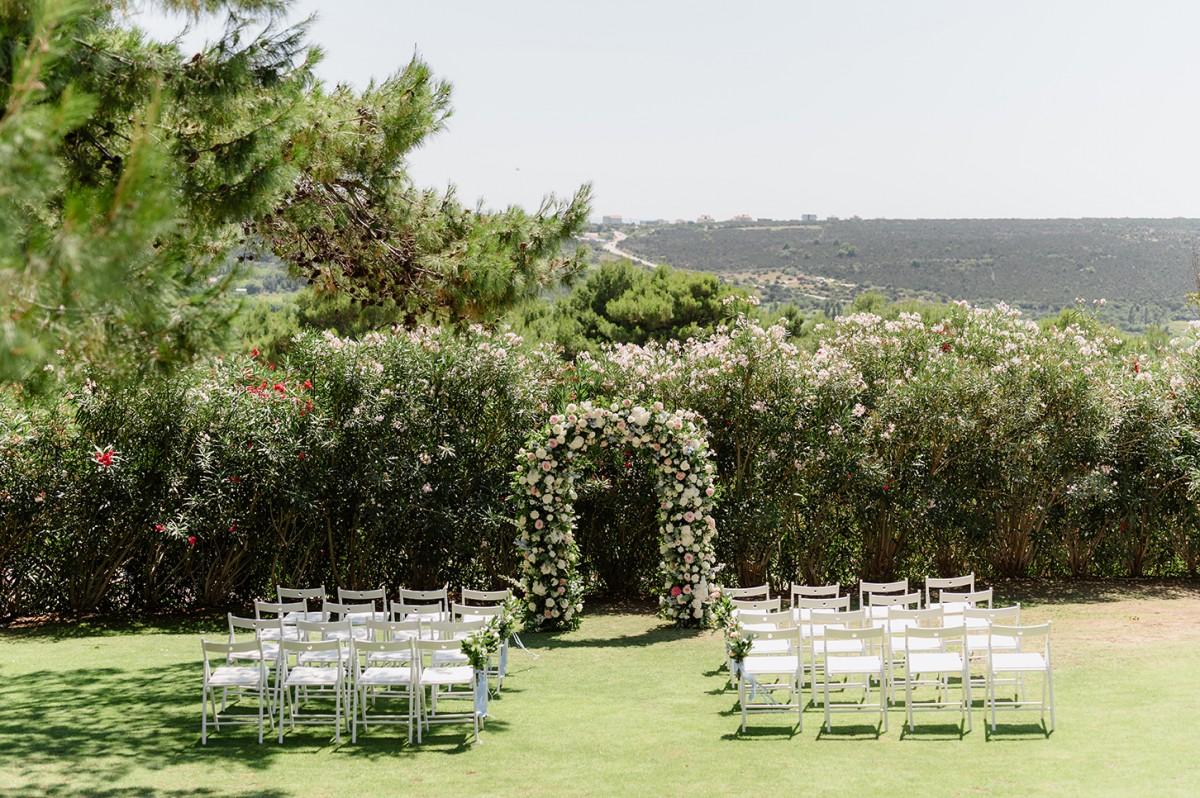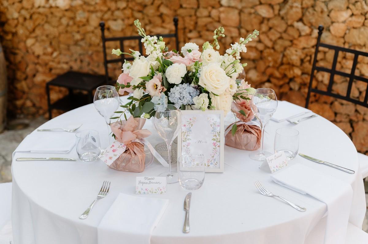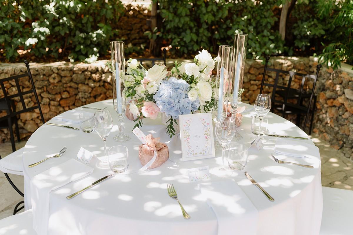 The couple envisioned a soft, elegant palette, and we brought their vision to life with lush arrangements of white, pastel pink, and blue flowers, creating a romantic atmosphere filled with delicate colors and textures. Every detail, from the floral design to the ceremony arch, was carefully curated to reflect their refined taste and love for Croatia’s coastal elegance.