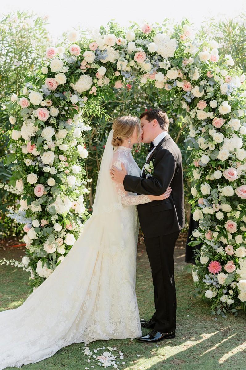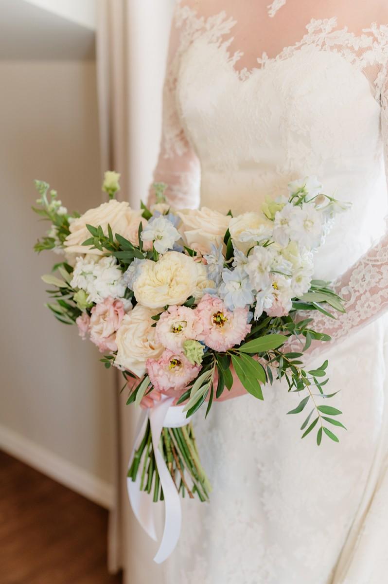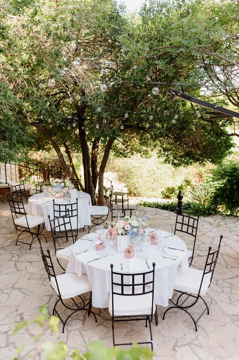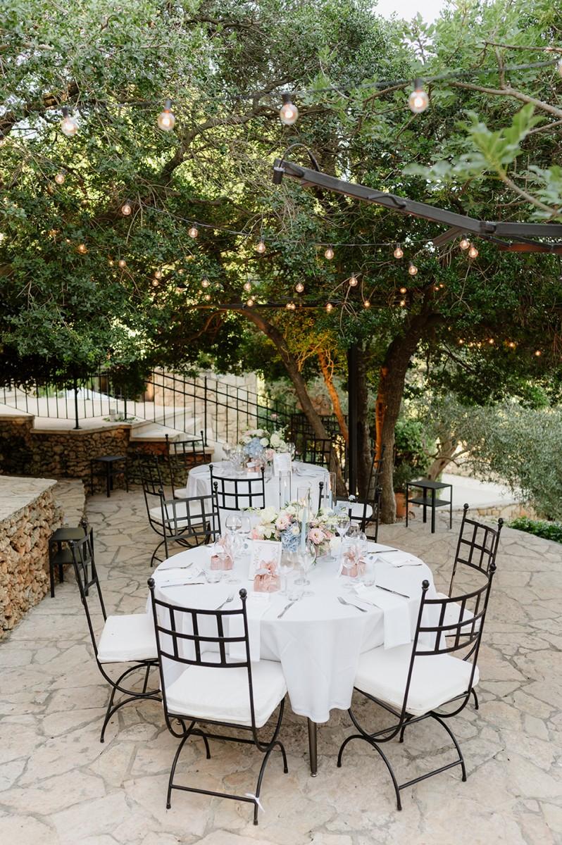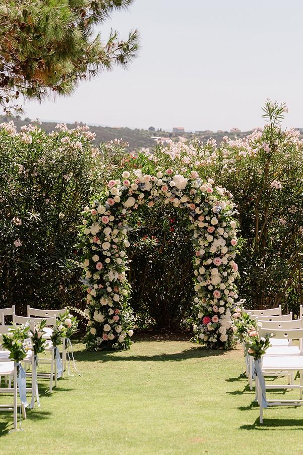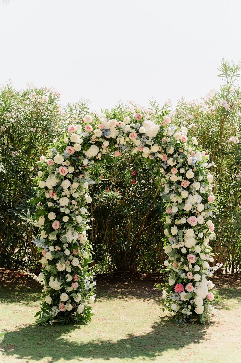 The couple envisioned a soft, elegant palette, and we brought their vision to life with lush arrangements of white, pastel pink, and blue flowers, creating a romantic atmosphere filled with delicate colors and textures. Every detail, from the floral design to the ceremony arch, was carefully curated to reflect their refined taste and love for Croatia’s coastal elegance.